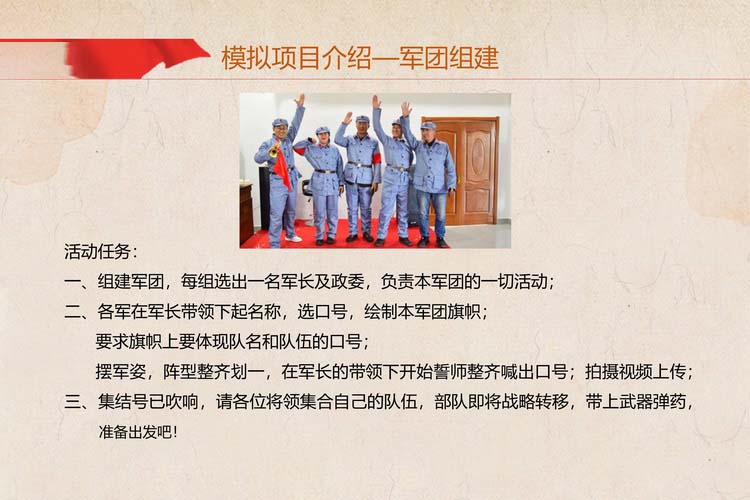 根據(jù)景區(qū)的地形,設(shè)計(jì)行軍路線,行進(jìn)中模擬紅軍長(zhǎng)征的部分活動(dòng)、戰(zhàn)役、險(xiǎn)阻,設(shè)置層層闖關(guān)任務(wù)。